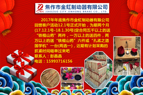 2017年年底焦作市金虹制動(dòng)器有限公司 回饋客戶活動(dòng)12.1號正式開始為期兩{17.12.1號-18.1.30號}定合同五千以上的送“鐵棍山藥”兩件,一萬以上的送四件,兩萬以上的送“鐵棍山藥”六件或“孔孟之道國學(xué)機(jī)”一臺(兩選一),近期有計(jì)劃采購的抓緊時(shí)間砸單過來吧!